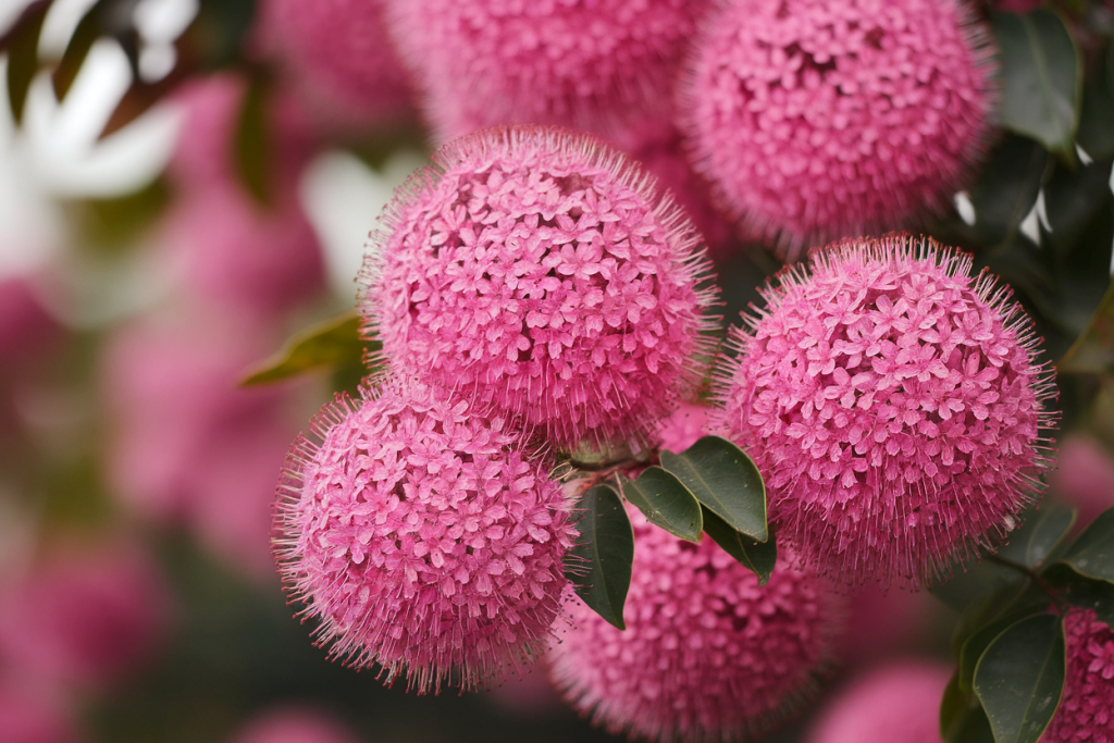 Le Dais cotinifolia reste sans doute l’arbre pompon le plus spectaculaire. Originaire d’Afrique du Sud, il produit des ombelles parfaitement sphériques de 3 à 5 cm de diamètre. Chaque ombelle regroupe entre 10 et 15 petites fleurs tubulaires, créant cet effet pompon si recherché.
